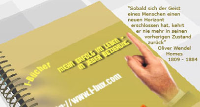 Seien Sie alles, was Sie sein können!![]() E-Books/Bücher für eine bewusste Lebensgestaltung. "I-Bux" - Was soll das heißen? I-Bux war ursprünglich als klangidentische deutsche Schreibweise für „E-Books“ gedacht. Ein „E-Book“ ist ein elektronisches Buch. Es liegt also zunächst als Datei vor. Unsere E-Books werden in unserem Shop im PDF-Format angeboten und können mit dem kostenlosen Acrobat-Reader gelesen werden. Einige unserer E-Books sind auf Amazon im mobipocket-Format für Kindle-Reader sowie auf Ciando (und teilweise auf XinXii) im Format epub erhältlich.