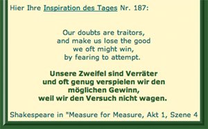 Aber uns allen ist wesentlich mehr möglich als wir gemeinhin annehmen. Und der Dreh- und Angelpunkt, der "Schlüssel", ist unsere eigene Einstellung. Negative Denkmuster erzeugen eine Schwingung, die uns den erwünschten Erfolg verwehrt. Wo kommen solche schwarzseherischen Einstellungen her? Die meisten Menschen reagieren ihr Leben lang nur auf Situationen, sie achten darauf, nirgends anzuecken, vermeiden es, ihren eigenen Weg zu gehen und bleiben unauffällig in der Masse. Sie kommen gar nicht auf die Idee, dass sie eigene Entscheidungen treffen könnten. Da ist der Mensch nun mit einem phantastischen Hilfsmittel ausgestattet: mit seinem eigenen Geist. Aber dieser ist angefüllt mit einem Sammelsurium an negativen Gedanken und Einstellungen. Nun will eben dieser Mensch etwas Bestimmtes erreichen - und seine eigenen negativen Denkmuster widersetzen sich diesen Wünschen. Ein Beispiel: Sie möchten gerne in Ihrem Beruf erfolgreich sein. Ihr vorherrschendes Denkmuster besagt jedoch, dass Sie nicht kompetent seien, Sie glauben von sich selbst, dass Sie "zwei linke Hände" hätten und es nie zu etwas bringen werden. So wie die Wirtschaftslage heute aussieht, stehen Sie bestimmt schon auf der Abschlussliste. Mit einer dermaßen negativ gefärbten Einstellung sabotieren Sie sich selbst. Sicherlich würden Sie gerne beruflich weiterkommen, Sie sind auch lernbereit und zeigen Einsatz - aber Ihre eigene Schwarzseherei steht Ihnen im Wege. Ihr Unterbewusstsein macht keine Unterschied zwischen dem, was für Sie gut oder schlecht ist. Es gibt Ihnen keinen Wink nach dem Motto: "Lass das lieber bleiben." Ihr Unterbewusstsein ist der "Beweisführer". Es reagiert lediglich auf die Anweisungen, die Sie ihm mit Ihrem Verstand (dem Tagesbewusstsein) erteilen und verfälscht die Wirklichkeit so, dass Sie das anziehen, was Sie in Ihrem Innersten glauben. Ihre Wirklichkeit bestätigt also, was Sie denken und glauben. Und deshalb werden Sie dies auch weiterhin denken und glauben, immerhin sehen Sie ja in Ihrem täglichen Leben die "Beweise". Dies ist ein Teufelskreis, der entstanden ist, weil irgendwann einmal negative Gedanken am Anfang standen. Wie kommen Sie aus diesem Schlamassel wieder heraus? Es gibt nur einen Weg: Ändern Sie Ihre geistigen Einstellungen! In der Folge wird sich auch Ihre Wirklichkeit verändern. Indem Sie Ihre Einstellungen verändern, fangen Sie an, in Ihrem Leben selbst Regie zu führen. Jetzt sind Sie nicht mehr Spielball der äußeren Ereignisse, jetzt verursachen Ihre Erlebnisse. Sehen Sie sich die Bereiche an, in denen Sie noch Nachholbedarf haben. Wo soll etwas verbessert werden? Als nächstes achten Sie ganz bewusst auf Ihre Gedanken. Begrenzen Sie sich damit vielleicht selbst? Reden Sie sich selbst Zweifel ein? Sind Ihre Gedanken für oder gegen Sie? Nehmen wir auch hier wieder ein Beispiel: Sie haben das Alleinsein satt und möchten endlich Ihren Lebenspartner finden. Aber - Sie sind ja auch nicht erst gestern auf die Welt gekommen, Sie haben also bereits einschlägige Erfahrungen gesammelt. Und mit dem anderen Geschlecht ist das alles mehr schlecht als recht gelaufen. Das hat sich zu der Einstellung verdichtet, dass tragfähige und harmonische Partnerschaften heutzutage so selten seien wie sechsblätterige Kleeblätter. Man bräuchte sich doch bloß umzuschauen; wer möchte denn in "in so einer Beziehungskiste" stecken? Dennoch: Der Wunsch ist nach wie vor da. Aber irgendwie lernen Sie immer wieder den oder die Falsche kennen. "Ich hab's doch gleich gewusst .." Nun - Sie könnten natürlich den Doppelband "So gewinnen Sie Ihr Herzblatt (wieder) für sich " studieren, um zumindest die gröbsten Fehler zu vermeiden, aber uns geht es hier nur um das Grundprinzip: Sobald Sie erkennen, dass Ihre eigenen Einstellungen immer wieder dazu führen, dass Sie ständig "Partner" anziehen, die Ihr inneres Negativbild bestätigen, sind Sie bereits einen Riesenschritt weiter. Jetzt brauchen Sie nicht mehr auf "die" Männer oder "die" Frauen zu schimpfen, sondern wissen, wo Sie ansetzen müssen - genau zwischen Ihren eigenen Ohren! Solange Sie dies nicht tun, werden Sie weiterhin abwegige Dinge glauben und jede mögliche Partnerschaft im Keim ersticken bzw. Leute anziehen, die ebenso konfuse Gedanken haben. Auf das Gesetz der Anziehung wird übrigens in mehreren E-Books eingegegangen, z.B.: