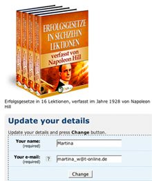 | Der Schlüssel zum Erfolg ist das Tun, die Umsetzung des Gelernten. Und der Schlüssel zum Tun ist der Glaube. Wenn Sie nicht in Ihre Zukunft investieren, werden Sie sie zu "locker" sehen; indem Sie in Ihre positive Zukunft investieren, behandeln Sie sie auch mit Respekt. Es ist eine Tatsache, dass wir mit etwas pfleglicher und sorgfältiger umgehen, wenn wir dafür auch Geld ausgegeben haben. Aber es gibt auch noch einen praktischen Grund: Die einzelnen Online-Beiträge sind immer nur Ausschnitte. Ein Beitrag befasst sich beispielsweise mit dem Gesetz der Anziehung, der nächste mit Investitionsmöglichkeiten, der dritte zeigt Ihnen auf, welches gestörte Verhältnis Sie zu Begriffen wie "Gott" oder "Geld" haben, der vierte gibt Ihnen Tipps für eine tragfähigere Partnerschaft ... Jeder Beitrag soll Ihnen helfen, Sie bei Ihren langfristigen Zielen und Zukunftsplänen zu unterstützen - aber keiner dieser Beiträge ist als das A und O zu verstehen, keiner ist vollständig. Falls Sie zum Beispiel mit Müh und Not über die Runden kommen und die Ursachen für einen positiven Geldfluss schaffen wollen, ist es sicherlich hilfreich, die entsprechenden Artikel zu studieren. Klüger ist es jedoch, ein komplettes E-Book, das Ihnen das Warum und das Wie Schritt für Schritt und zusammenhängend aufzeigt zu erwerben. Dadurch verstehenden Sie den Hintergrund und sind auch motivierter, das Gelesene umzusetzen. Nur darauf kommt es an. Lassen Sie sich übrigens nicht von einigen E-Book-Titeln täuschen: Auch wenn der Titel zum Beispiel auf finanzielle Aspekte Bezug nimmt, gelten die beschriebenen Prinzipien immer für alle Lebensbereiche. Was Sie in den E-Books erfahren, können Sie kostenlos nicht erhalten. |