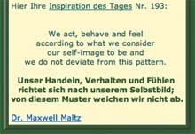 | Hintergrund: 1960 herausgegeben, wurde dieses Buch mittlerweile 25 Millionen Mal verkauft. Das Ungewöhnliche daran war, dass es von einem Schönheitschirurgen stammt. Maltz stellte fest, dass viele der von ihm operierten Patienten trotz einschneidender körperlicher Veränderungen keine Verbesserung ihres Selbstbildes erfuhren. Dies veranlassste ihn, sich mit den inneren Wunden zu beschäftigen. Er kam zu dem Schluss, dass die Ursache in verzerrten Wahrnehmungen und Fehlanschauungen bestünde und entwickelte daraufhin eine nach ihm benannte Visualierungstechnik. | Zitat: "Leute, die der Meinung sind, dass sich das Leben nicht lohne, sagen damit aus, dass sie keine lohnenswerten persönlichen Ziele haben. Setz dir ein Ziel, wofür sich dein Einsatz lohnt! Noch besser: Nimmt dir eine Aufgabe vor! Damit hast du immer etwas vor dir, in das du kein Kraft stecken kannst und das dir Hoffnung gibt." |